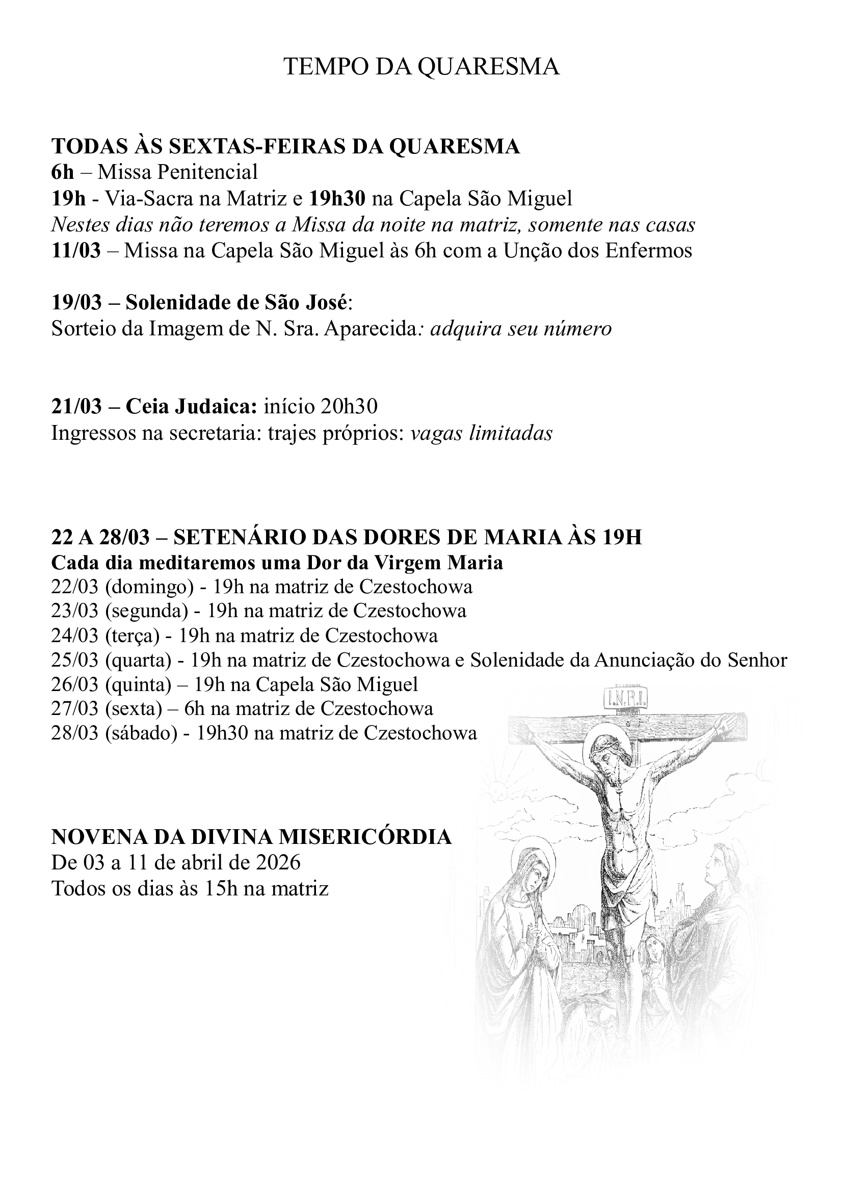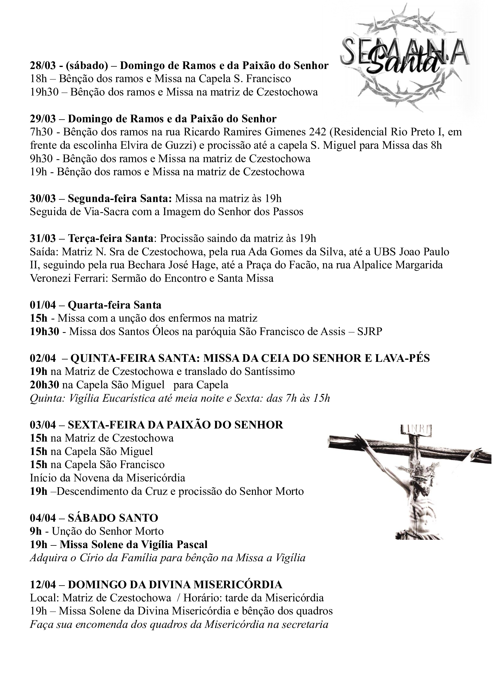 Segunda à Sexta-feira 19:00sábado: 19:30Domingo: às 9:30 e às 19:00